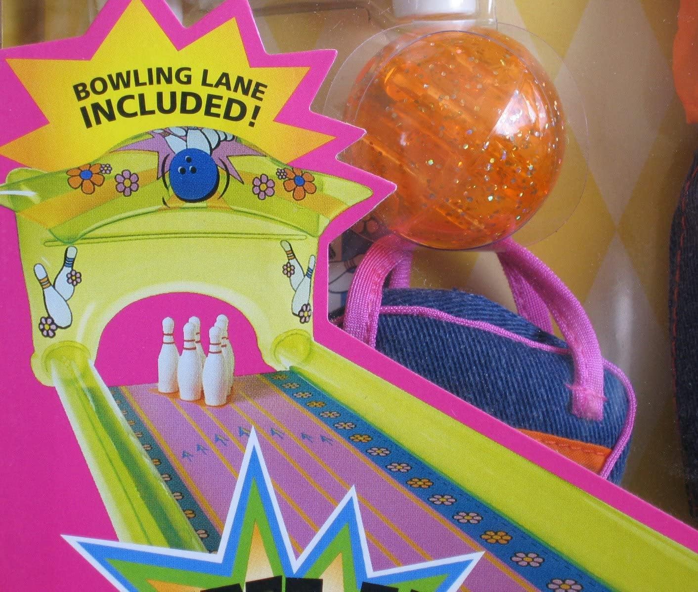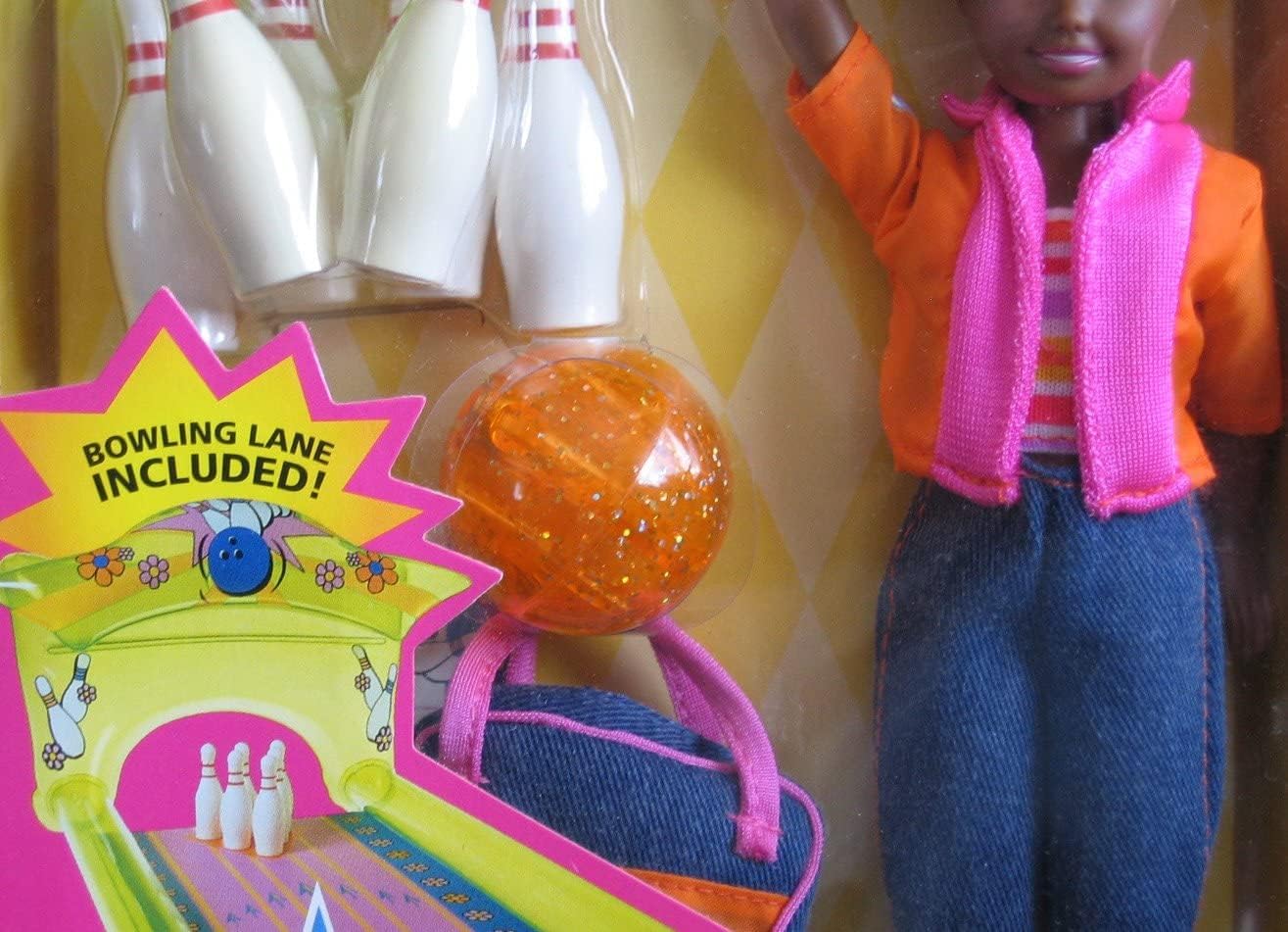 Bowling Party Janet Doll is a 1998 Mattel production. Includes: Janet Doll approx. 8.5" tall. Janet Doll wears a pink & orange Jacket, a striped Top, blue denim Capris, a pair of white w/orange flower Socks, & a pair of orange & yellow Bowling Shoes. Doll comes w/a Bowling Lane, Bowling Pins, a glittery orange Bowling Ball, a blue denim w/pink handles Case, & a Hair Brush.