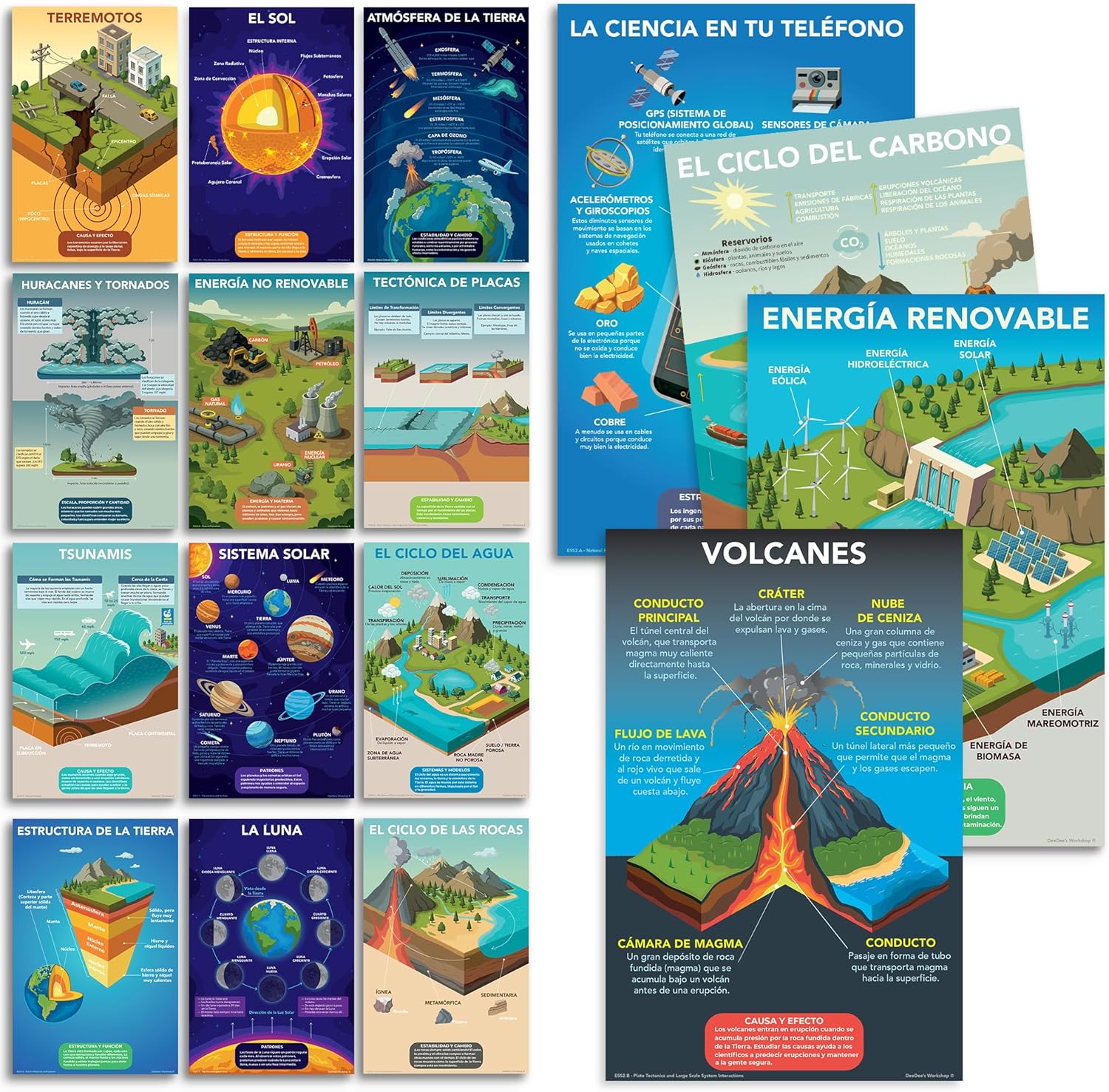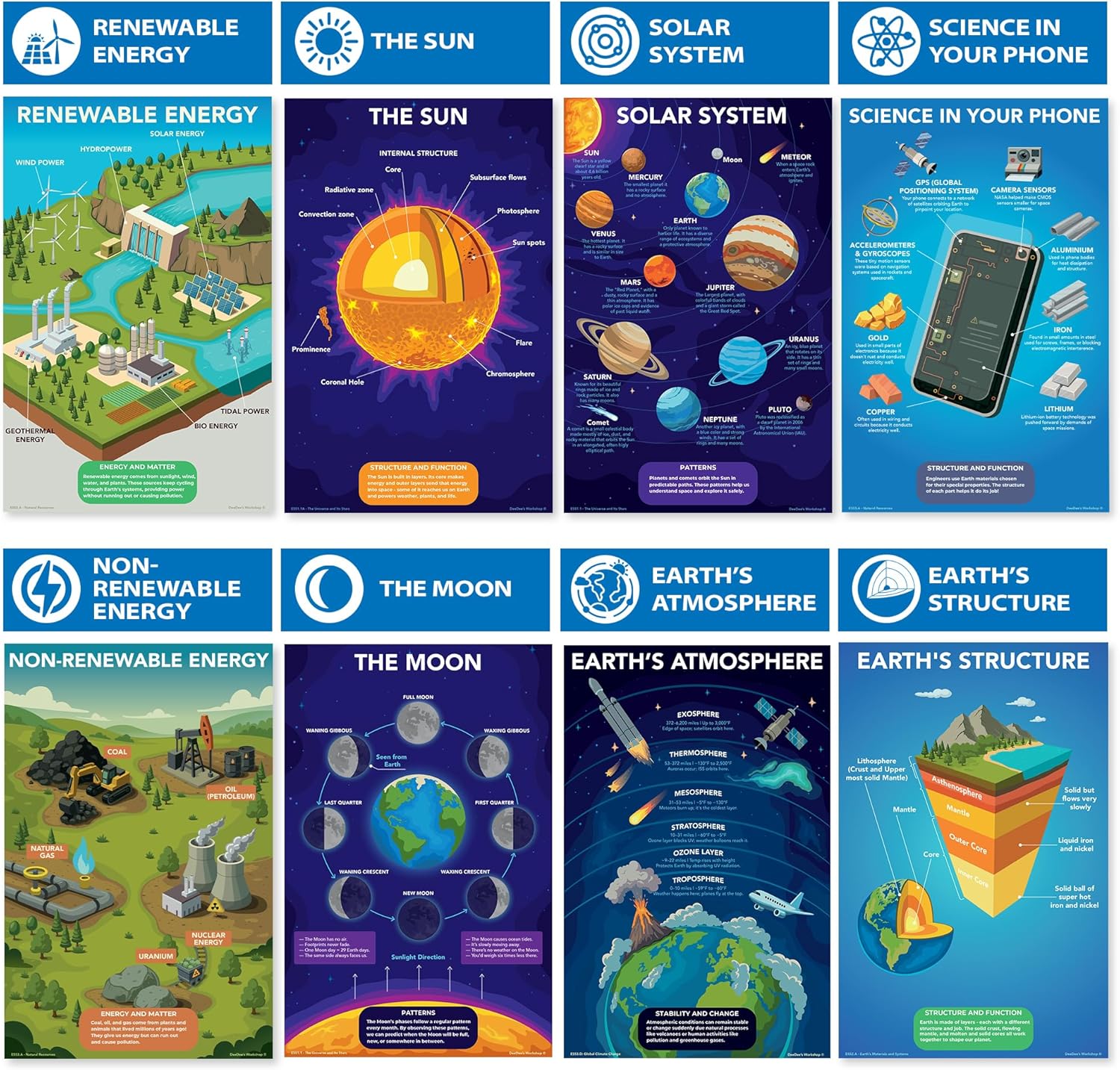 Trusted by teachers and designed to support visual learners, inquiry-based instruction, and student engagement. This comprehensive set of 16 educational posters covers essential topics including the solar system, natural phenomena, and earth sciences, all aligned with national science standards. Each 11 x 17 inch poster features vibrant, colorful illustrations and carefully researched content that brings science concepts to life. The premium glossy finish ensures these posters will maintain their quality throughout the school year. Perfect for elementary and middle school classrooms, these wall-mounted displays help students understand complex topics like plate tectonics, the water cycle, renewable energy, and earth's structure through visually appealing graphics. The posters incorporate crosscutting concepts that connect different aspects of science learning, making them valuable teaching aids for educators while sparking students' curiosity about science and engineering.