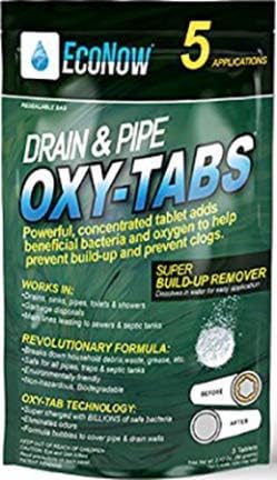 Sewage and other debris tend to accumulate in main lines leading to both sewers and septic tanks. This can occur in both in old and new homes and can be exacerbated by water saving or low flow toilets that’s often do a poor job of moving waste out of sewage lines. This can lead to build-up which can result in clogs, messy back-ups and odors. Drain & Pipe Oxy-tabs provide oxygen, adds enzymes that encourage the breakdown of household debris, waste, organic solids, fats and grease in both the sewer and main lines to remove the build-up and restore the flow. It also eliminates unpleasant odors. OXY-TAB technology does 3 things: 1) Eliminates odors, 2) Formula bubbles and fizzes to cover all pipe walls, 3) Is environmentally friendly, non-hazardous and biodegradable. Dissolves in water for easy application.