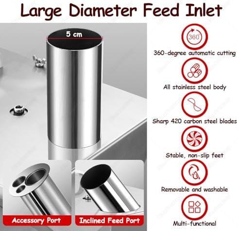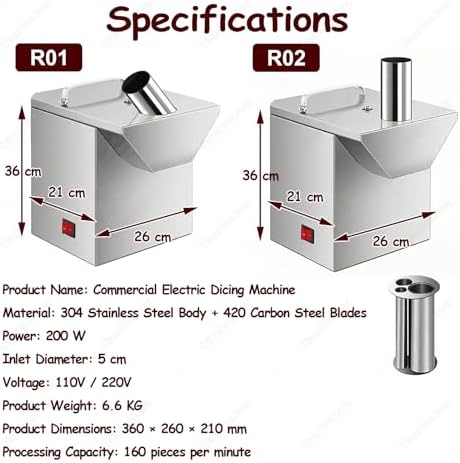 Introducing our versatile electric dicing machine, designed to elevate your meal prep experience by combining efficiency, precision, and durability. This essential kitchen tool is ideal for both home cooks and culinary enthusiasts, enabling you to prepare large quantities of ingredients quickly and effortlessly. **Key Features:** - **Powerful Performance:** Equipped with a 200W pure copper motor, this machine boasts a processing capacity of up to 100 kg per hour, allowing you to tackle even the busiest meal prep sessions with ease. - **Versatile Cutting:** With 420 carbon steel blades, it adapts to various ingredients, from crisp vegetables to tender meats, ensuring consistent cuts every time. - **Convenient Design:** The 5 cm wide feed inlet accommodates whole pieces of food, reducing prep time and minimizing waste. - **Safety First:** The automatic feed feature promotes safe operation, letting you focus on your culinary creativity without worry. - **Easy Maintenance:** Constructed entirely from stainless steel, this dicing machine is not only durable but also easy to clean, making it a practical addition to any kitchen. **Specifications:** - **Product Name:** Commercial Electric Dicing Machine - **Material:** 304 Stainless Steel Body + 420 Carbon Steel Blades - **Power:** 200W - **Feed Inlet Diameter:** 5 cm - **Processing Capacity:** 160 pieces per minute - **Product Dimensions:** 360 × 260 × 210 mm - **Product Weight:** Approx. 6.6 kg **What’s Included:** - Electric Dicing Machine × 1 Whether you're preparing meals for a family dinner or meal prepping for the week, our electric dicing machine is your reliable partner in the kitchen. For any questions or assistance, feel free to reach out to us via email, and we promise to respond within 24 hours. Experience the difference in meal preparation today!